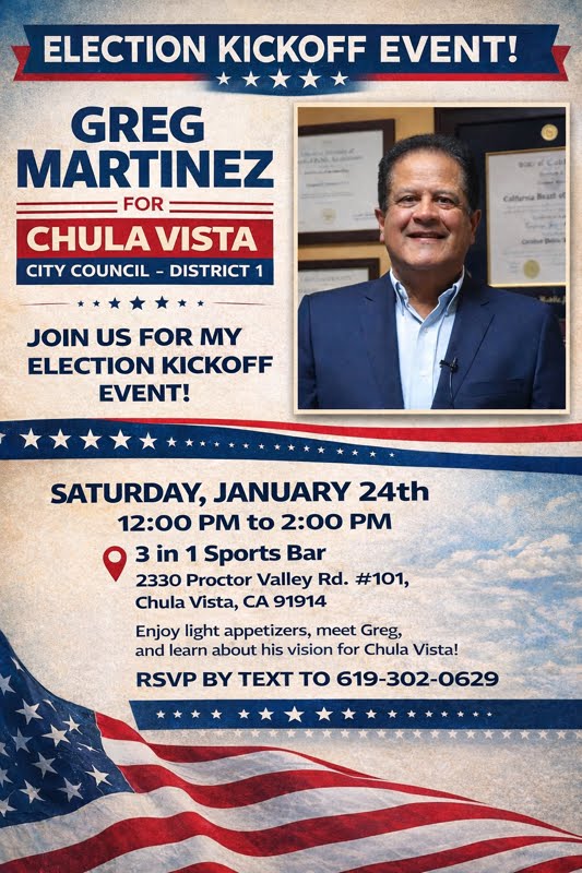 This is your opportunity to meet the candidate personally and hear directly about his vision for the future of Chula Vista. Whether you are concerned about local ordinances, safety, or fiscal responsibility, this event is the perfect place to start the conversation and see how Greg plans to serve District 1.